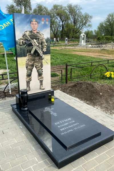 Ростовой памятник для молодого военного памятник выполнен в лаконичном черном цвете, сочетает в себе фигурную гранитную стелу и открытое надгробие. На стелу нанесена цветная печать портрета в полный рост. Формы и размеры памятника подобраны специалистами с учетом нагрузки и визуального восприятия ритуального изделия. Мягкие изгибы контура стелы придают памятнику индивидуальность, в то же время не выходя за рамки православных канонов.