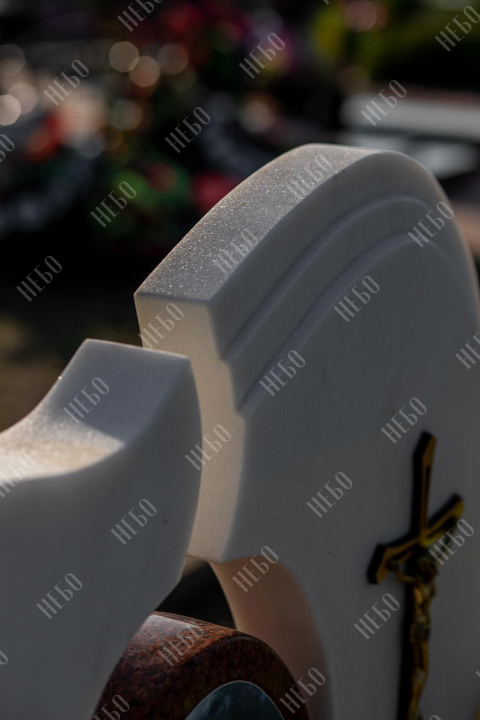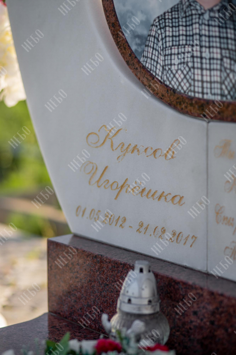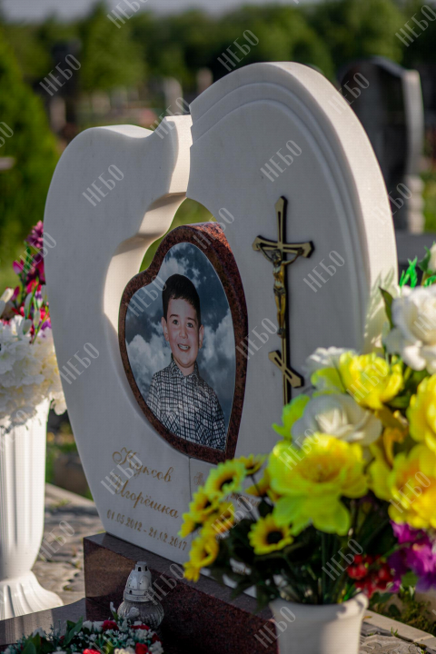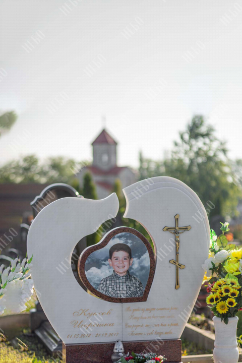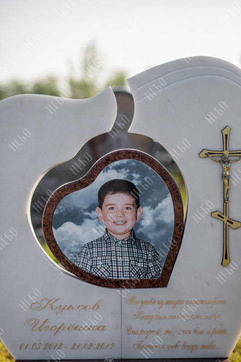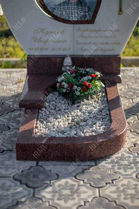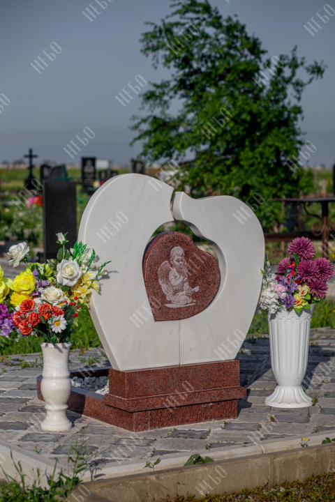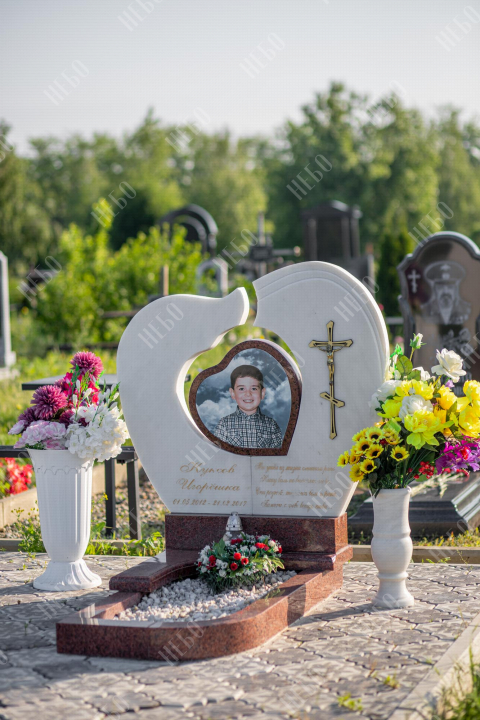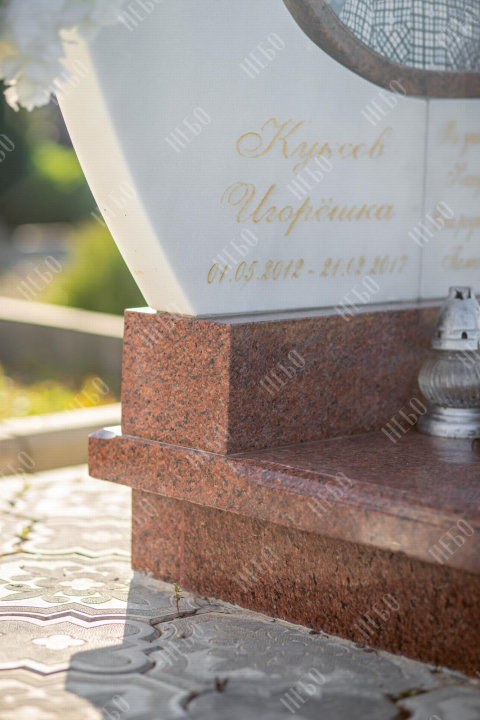 Детский памятник ассиметричной формы с фигурной стелой, вазой и открытым надгробием. Накладной крест золотого оттенка на стеле является акцентным элементом и дополняет композицию ритуального изделия. Гранитный элемент в виде сердца по центру стелы служит основой для размещения фотографии и контрастирует на фоне белого мрамора. Открытое надгробие позволяет использовать пространство на его поверхности для высадки цветов и других растений. Размеры стелы и других элементов памятника соответствуют заданным нормам при имеющейся нагрузке и исключают деформации со временем.
