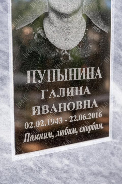 Фото на ритуальном изделии изготовлено методом гравировки алмазными иглами на черном граните. Далее фотография вставлена в памятник из выбранного материала, создавая эффект контрастности. Такой способ вставки изображения применяется в случае изготовления памятника из материалов светлых, серых, коричневых и других оттенков, гарантируя фотографии четкость и наилучшее качество, а готовому изделию долговечность. Благодаря использованию технологии гравировки на граните, фото не потускнеет со временем, не исказится и сохранит первозданный вид десятки лет.